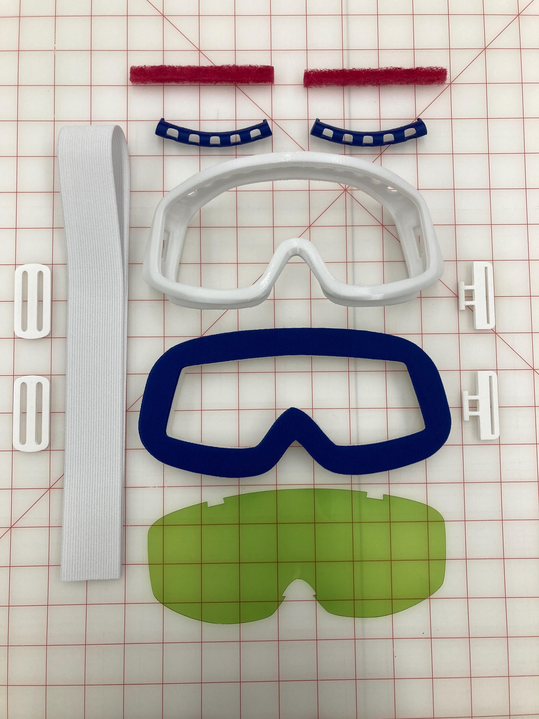 This listing is for a kit to build your own Hoth Rebel Trooper or Luke cosplay goggles. The kit includes the frames(with top and bottom vent holes pre-punched), elastic head strap mounts, 24” of elastic strap, foam interface, visor, top vents with filters, and sliders.